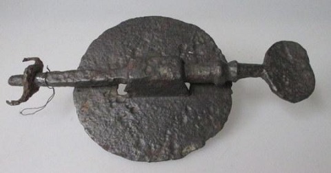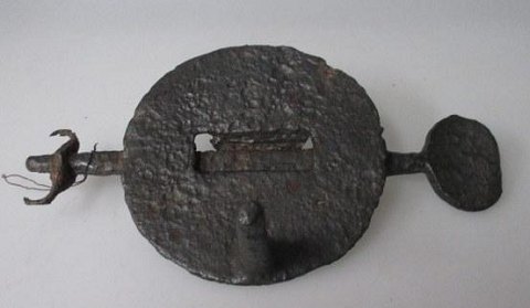 Antik håndsmedet lås i jern, Middelalder. L: 21 cm. Dia jernplade: 11 cm.