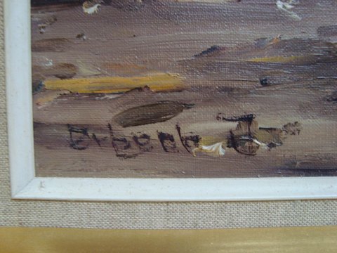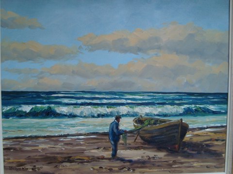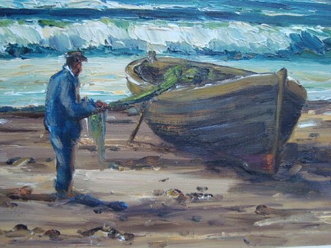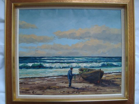 Maleri af Svend Ørbech Jacobsen - Strand med fisker og båd.