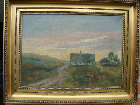 Maleri af Johan Jacobsen - Nordsjællandsk landskab med vej forbi en gård.