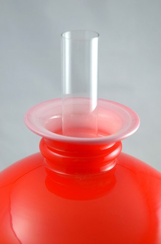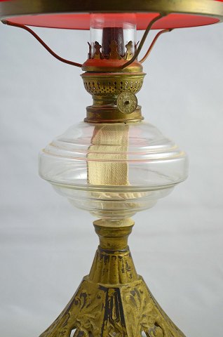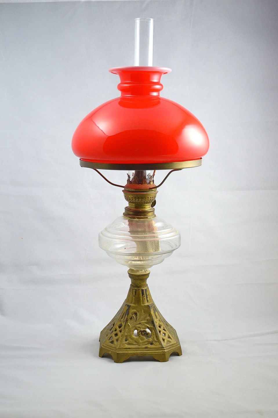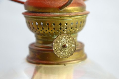 Petroleumslampe fra Kosmos Brenner med glasskærm på malet metalfod.