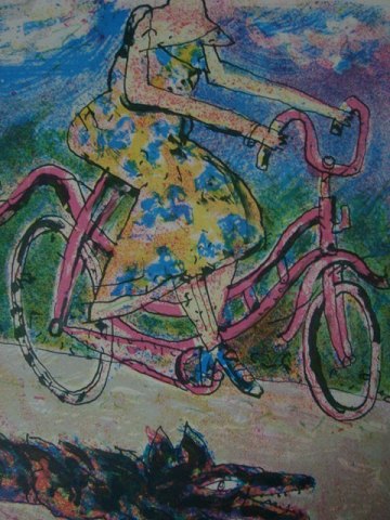 Cyklende kvinde og løbende hund 1991.