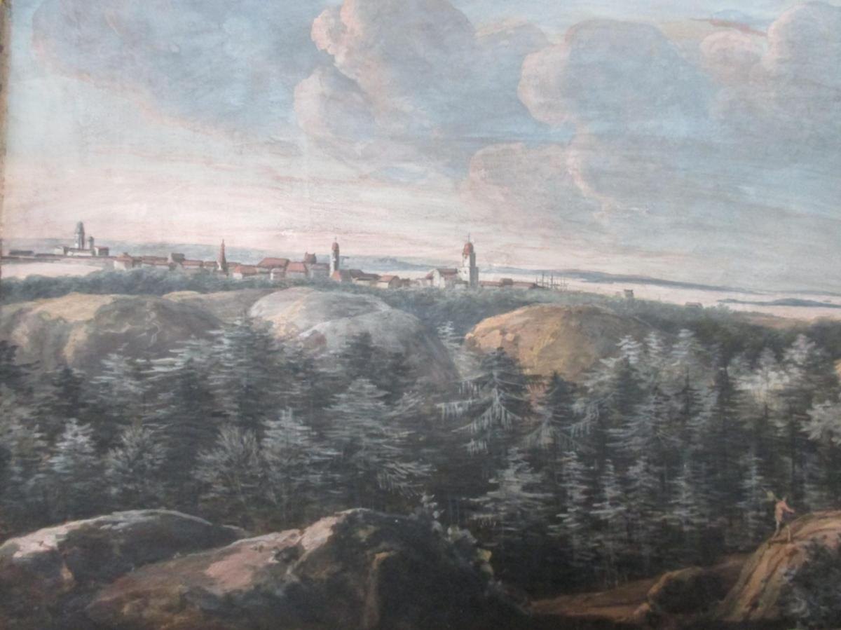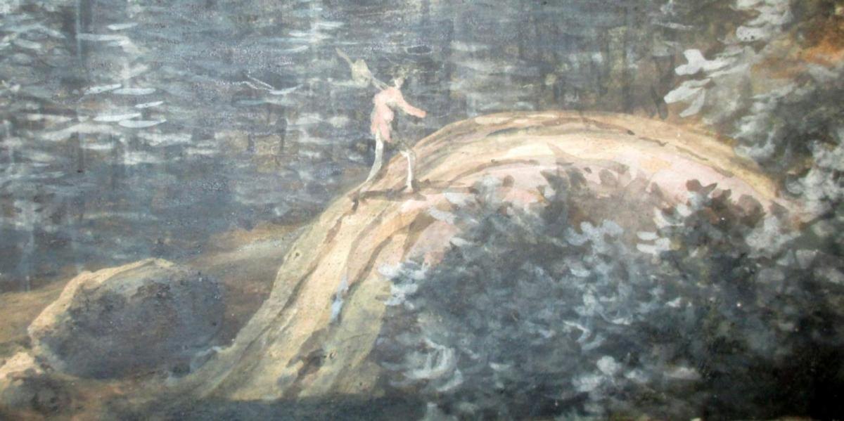 French artist, 19th c. Walker in the countryside. Around 1810 - 1840. In the vicinity of a major city. Gouache on cardboard. Unsigned. 37 x 54 cm. On the back labels. In contemporary mahogany frame with corner ornaments.
