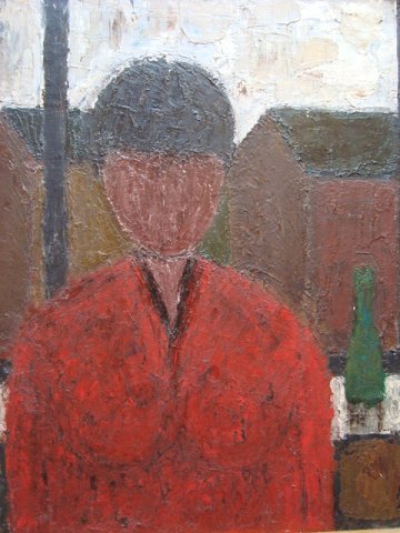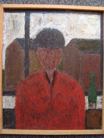 Maleri af Peder Brøndum Sørensen - Kvinde i rødt ved vindue 1960.