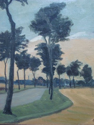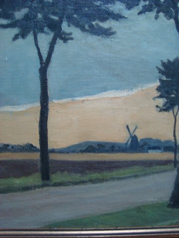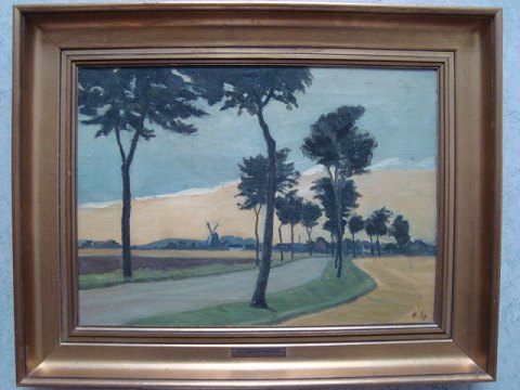 Maleri af Ole Søndergaard - Landevej med træer og landsby i baggrunden med mølle.