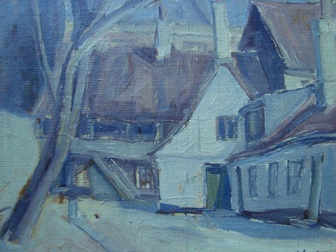 Maleri af Ole Sværdpiil - Vinterparti fra baggård 1965.