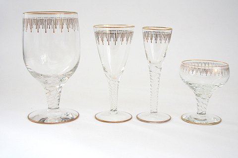 Holmegaard, Marselisborg (Amager) med snoet stilk og guldekoration, fremstillet i 1965 til det tyske kaffe og spisestel Marselisborg. Amagerglasset er 1955 designet af Jacob E Bang på Kastrup glasværk.