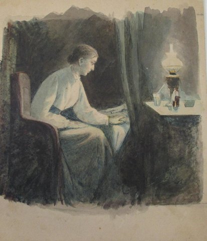 Larsen, Knud (1865 - 1922) Danmark: Ved sygesengen. Akvarel. 18 x 16. Betegnet på bagsiden.