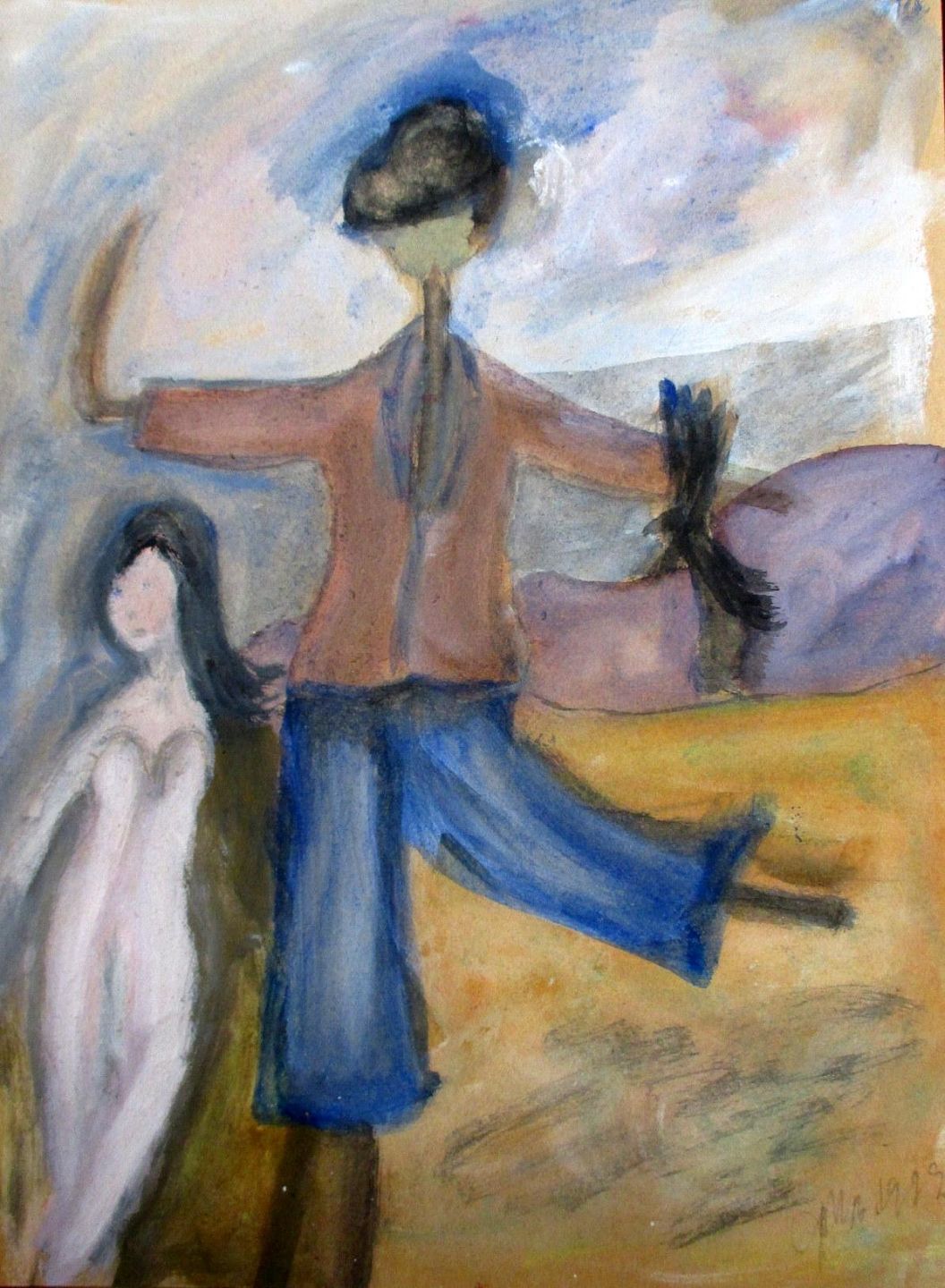 Bang, Charlotte Mary (19./20. årh.) Danmark: En nøgen kvinde og et fugleskræmsel. Akvarel, pastel på karton. Signeret: C.M.B 1919. 35 x 25,7 cm.