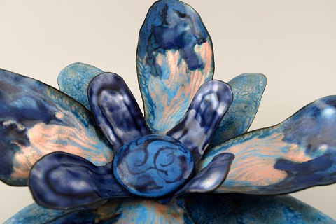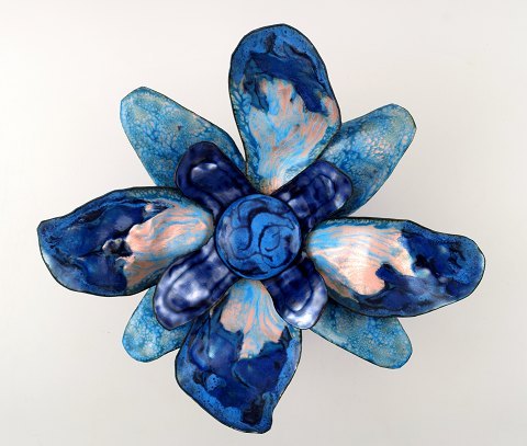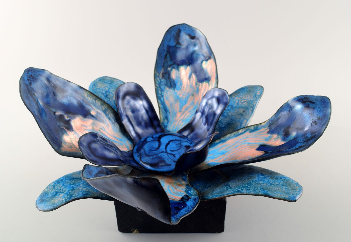 Bodil Eje (1932-2006). Unika skulptur af polykromt emaljerede kobberplader, sokkel af træ.