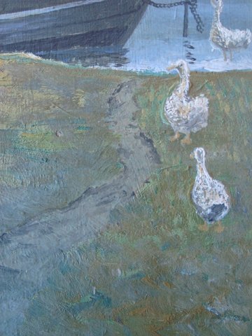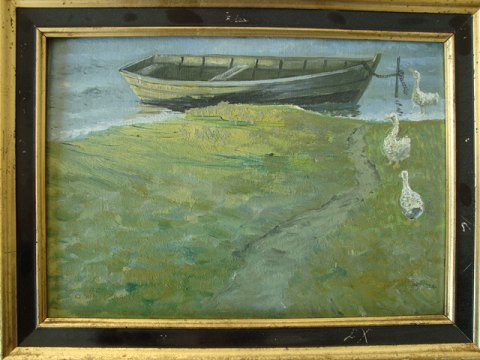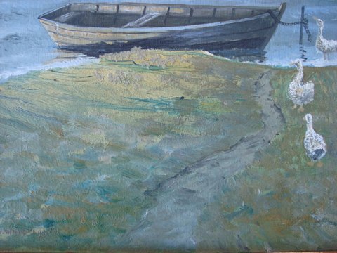 Maleri af Otto Westergren - Ænder ved søbred med båd.