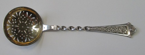 Strø ske i sølv, Danmark. 1904. I vikingeornamentik med snoet skaft. Forgyldt laf. L.: 17 cm.