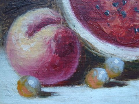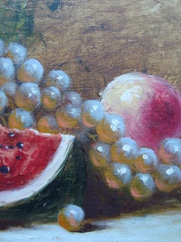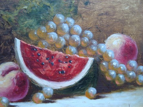 Maleri af K. Kovacs - Opstilling med vandmelon, druer og ferskner.