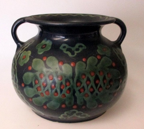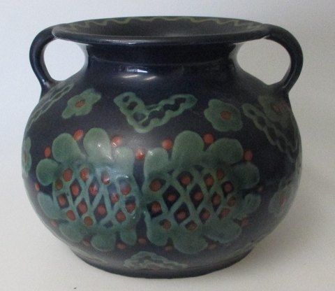 Skønvirke ørekrukke, ca. 1920, Danmark. Lertøj. Med overglasurer i blåt, rødt og grønt. Stemplet HS og mærke. H.: 14 cm. Dia.: 17,5 cm.