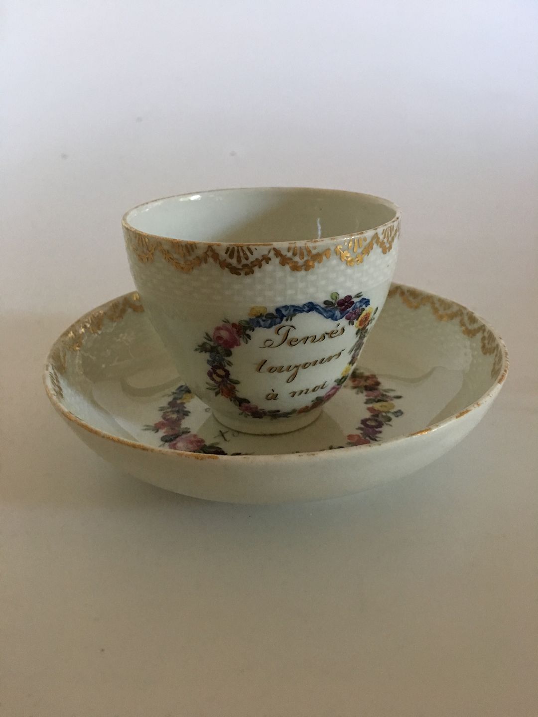Antik Royal Copenhagen kop og underkop med indskription fra 1790-1810. Med fransk indskription: Tænk altid på mig