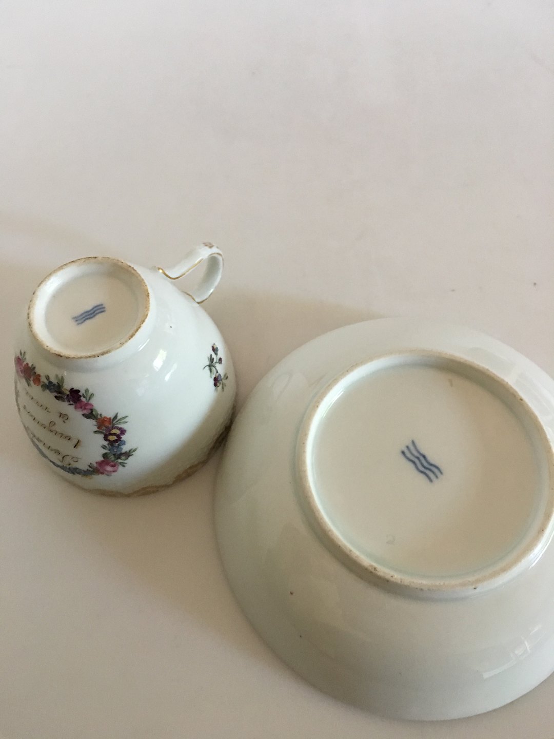Antik Royal Copenhagen kop og underkop med indskription fra 1790-1810