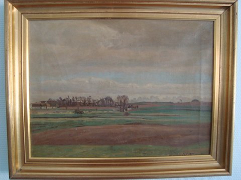 Maleri af Hans Knudsen 1921 - landskab med gårde.