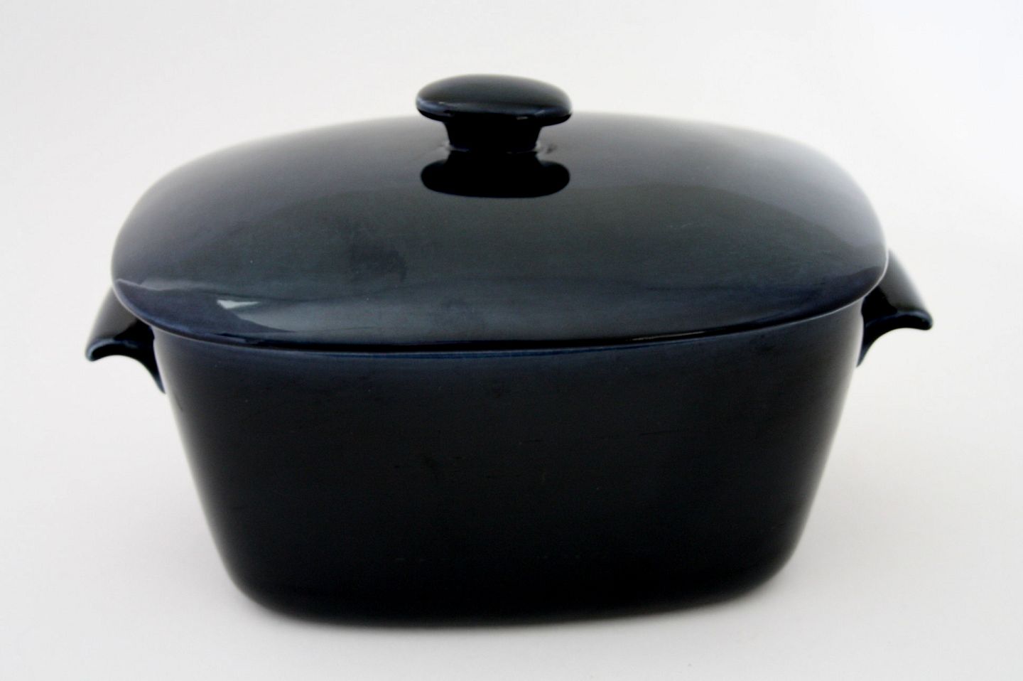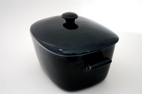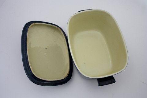 Text available in Danish: Rørstrand, Panera stegeso med låg. Kobolt blå og gul indvendig. Længde 25 cm. Bredde 16 cm. Højde 15 cm. Der er overflade ridser på begge sider. Pris: 250 kr. stk. Lager: 1