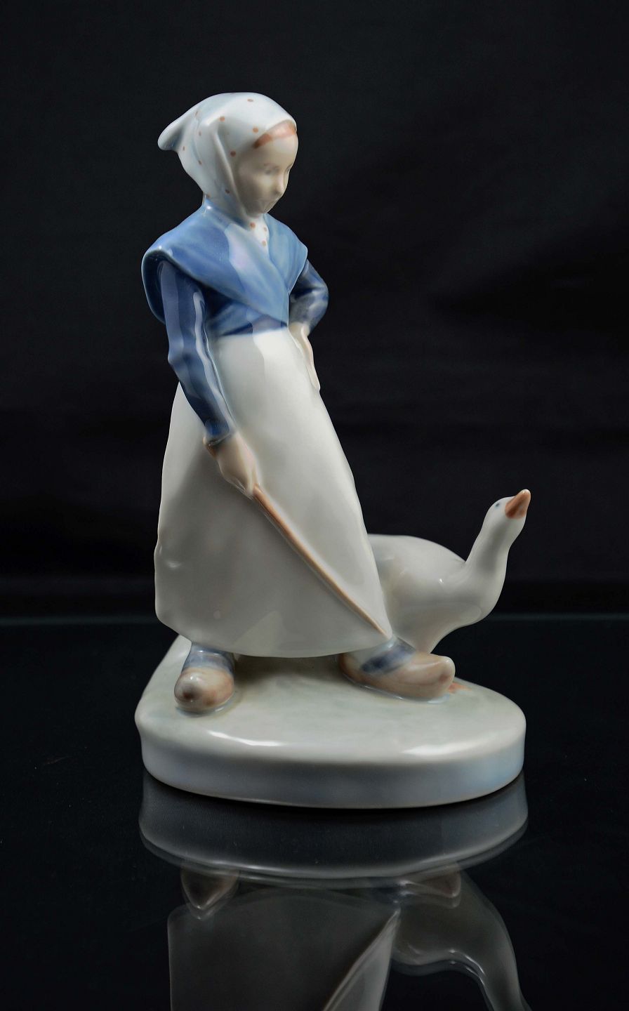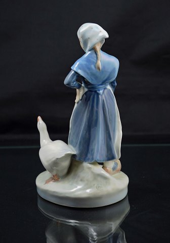 Text available in Danish: Figur af Pige med gås (nr. 528) af Christian Winther for Royal Copenhagen. Figuren er fra 1. sort. og den er i meget pæn stand.