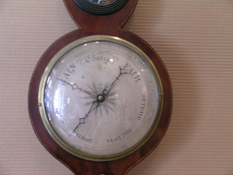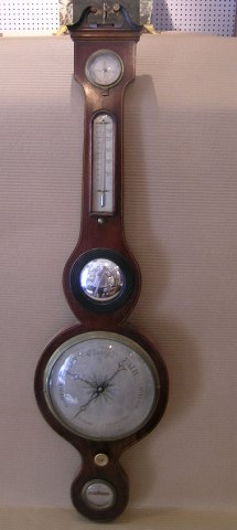 Barometer af mahogni med kantning af citrontræs intarsia. Desuden med hydrometer, termometer, vaterpas og butlersmirrow. Justeringsknap af horn. England 1835-45.