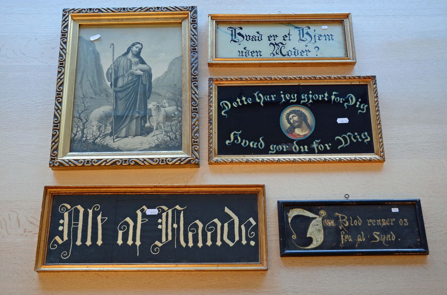 Text available in Danish: Forskellige billeder med religiøse motiver og skrifter. 5 stk. Alle i god brugt stand med aldersrelaterede brugsspor.