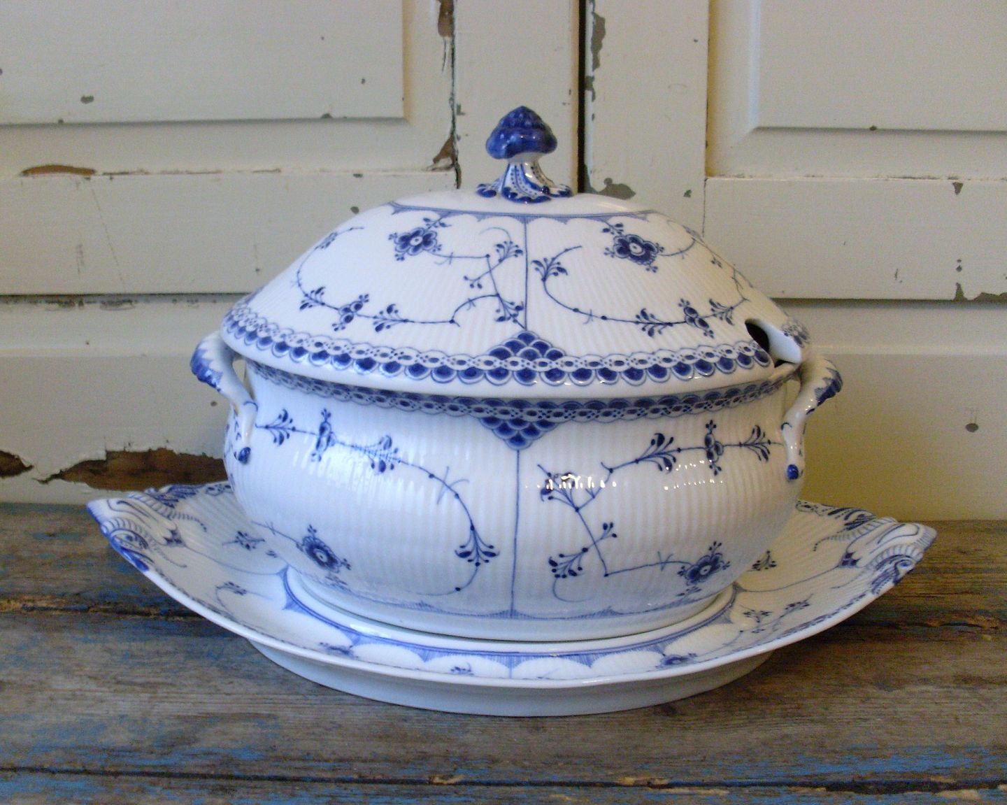 Royal Copenhagen Musselmalet halvblonde stor oval terrin med underfad
