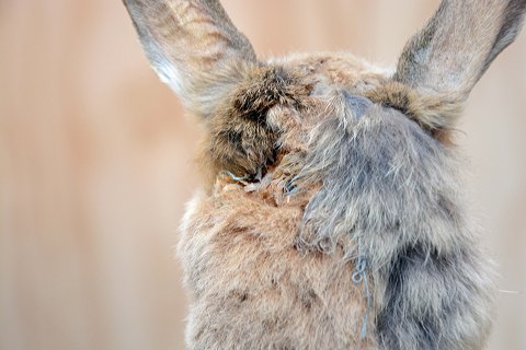 Mindre skade bag det ene øre og ved den ene forpote, ellers pæn stand