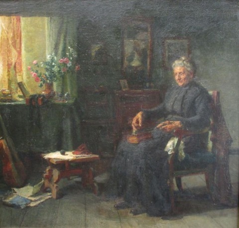 Find, Ludvig (1869 - 1945) Danmark: Interiør med ældre kvinde i en stol. Olie på lærred. Signeret.: Ludvig Find. 66 x 71 cm. I samtidig forgyldt ramme med hjørneornamentik.
