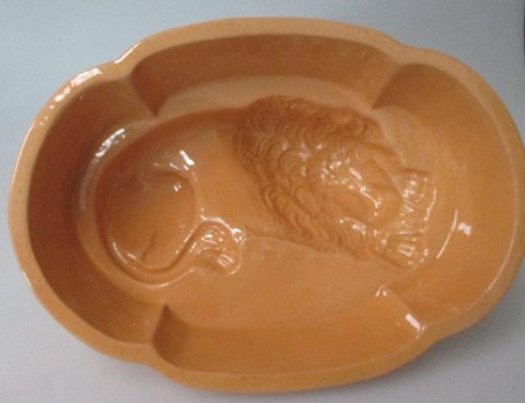 Buddingeform, Bornholm, Danmark, 19. årh. Form som liggende løve. Gul. L.: 20,5 cm. H.: 9 cm. Virkelig smukt eksemplar med lille kanthak på fodrand.