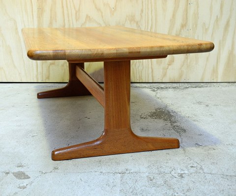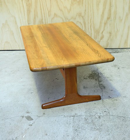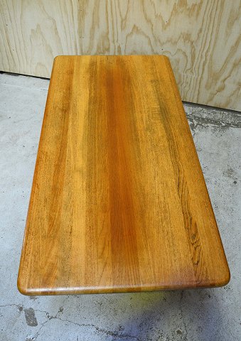 Text available in Danish: Lakeret sofabord i massiv teaktræ. Brugsspor på bordpladen - solblegning og enkelte overfladiske nøk. Pæn brugt stand.