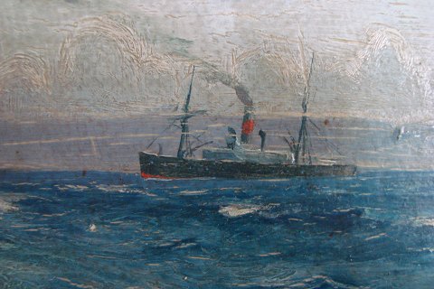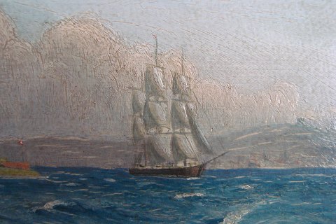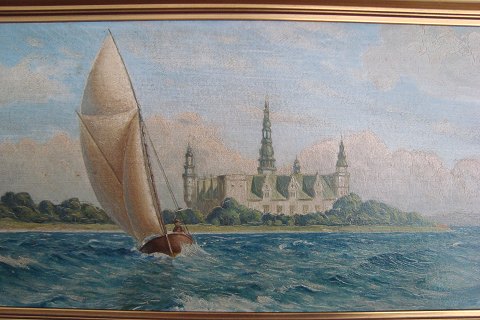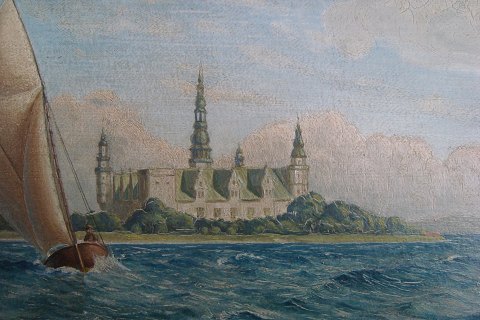 Maleri - Marine med sejlskibe og damper ud for Kronborg.