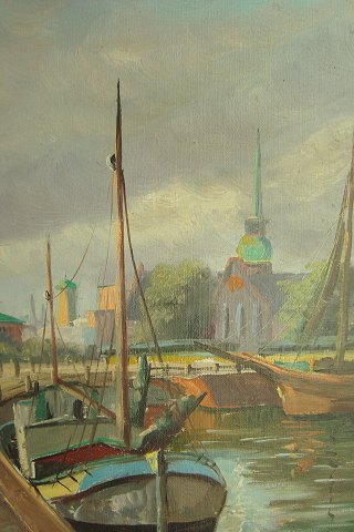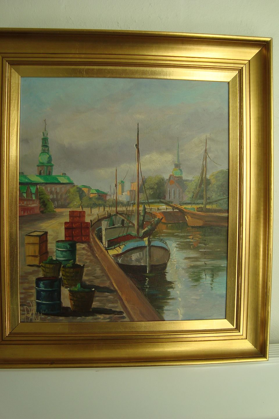Maleri - Parti fra Slotsholmskanalen med Børsen, Christiansborg Slot og Holmens Kirke (Bremerholm).