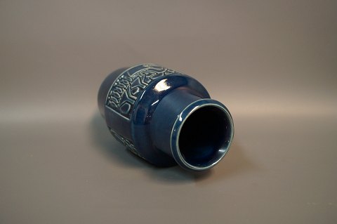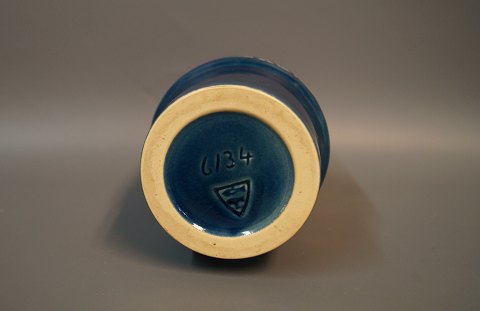Keramik vase med blå glasur og motiv på siden af Michael Andersen og søn, nr. 6134.