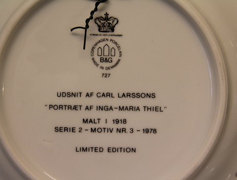 B&G 8727 1978 Carl Larsson plate - Series 2 - motif # 3 "Portrait of Inga-Marie Thiel" Painted 1918, 21.5 cm Bing and Grondahl Artist Plate After Carl Larsson Paintings. Limited Edition. Marked with the three Royal Towers of Copenhagen. Bing & Groendahl In mint and nice condition Karl Larson Sweden