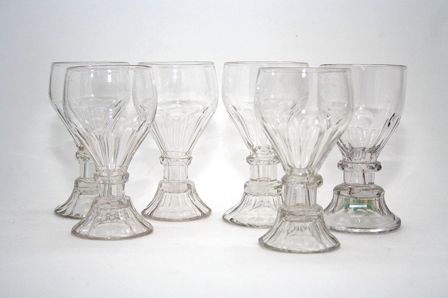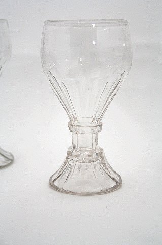 Strömbergshyttan, Vinglas med facetslibning påsat mellemstykke, rigler og trompetfod designet af Gerda Strömberg. Glassene er gamle og har brugsslid i form af udvendige ridser. Højde 12 cm. Diameter 6,2 cm. Pris: 675 kr. Samlet 6 stk