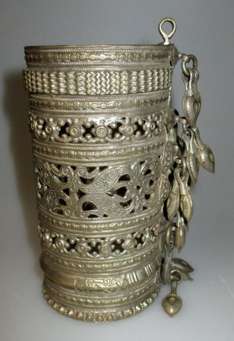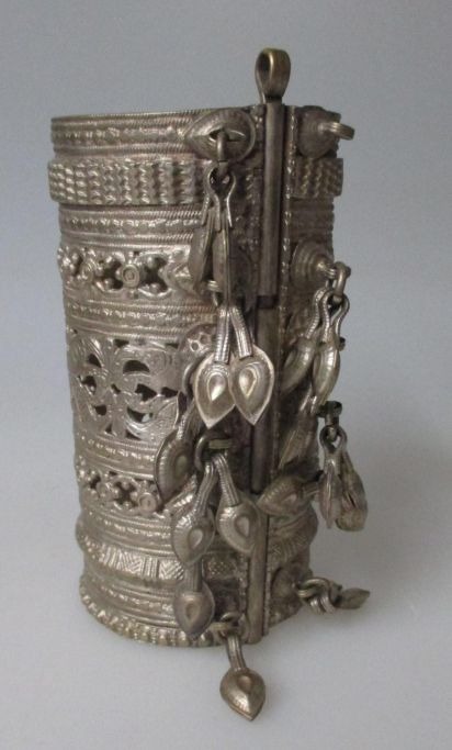 Afghansk Arm ring, 20. årh. Forsølvet metal. Med talrige dekorationer. Gennembrudt. Med små bjælder. H: 12,5 cm. Dia.: 6,5 cm.  Benyttes af kvinder ved dans. Har været udlånt til TV udsendelsen Krejlerkongen, TV 2.