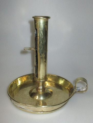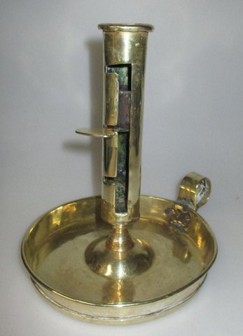 Dansk kammerstage i messing, 19. årh. Rund fod med holder; stamme med indstillig højde. H.: 18 cm.