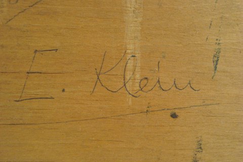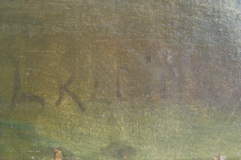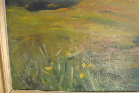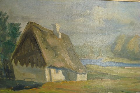 Maleri af Erik Klein - landskab med bondehus og sø.
