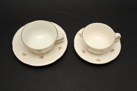 Kaffekop med underkop. Højde 5 cm. Diameter 9 cm. Fremstår med overfladekrakeleringer og lettere slidt guldkant. Pris: 150 kr. stk. Lager: 6
