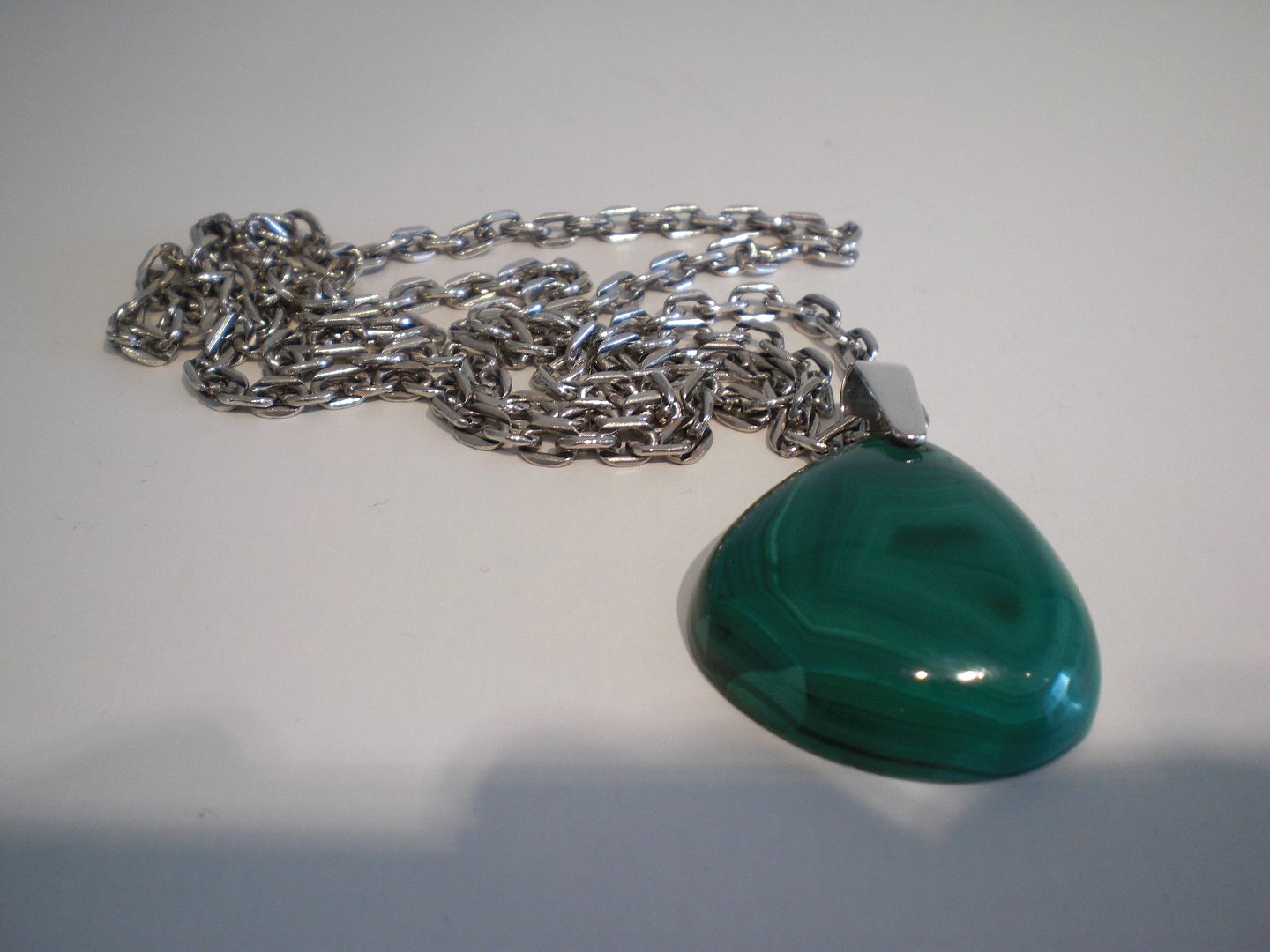Text available in Danish: Malakitvedhæng udført af Jørgen Rasmussen med sterling sølv montering i kraftig sterling sølvkæde.