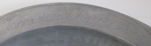 Stort antikt tinfad, 1853. Stemplet med mestermærke: GD L. Fane dekoreret med bladværk. På fane inskription: Christian Kruse 1853. Dia.: 40 cm. H.: 4,5 cm.
