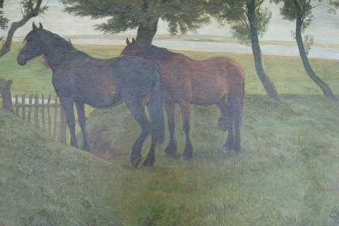 2 heste ved gærde ved Sebber med udsigt mod Nibe.