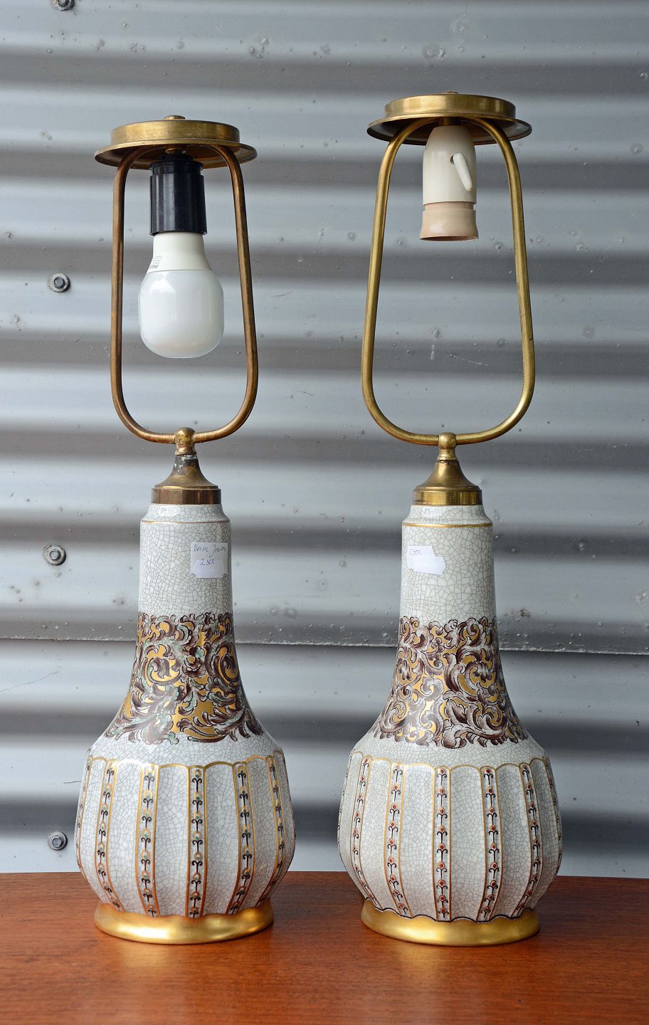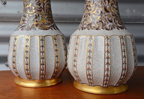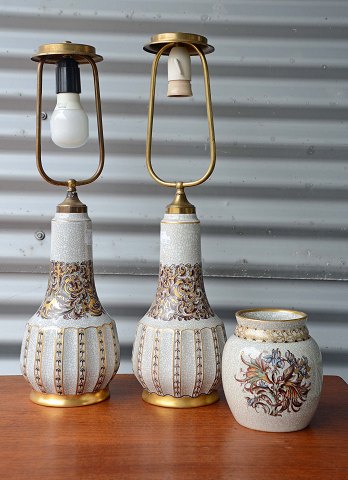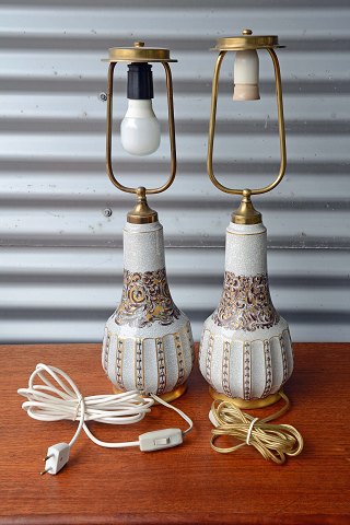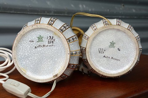 Et sæt bordlamper (nr. 132/323) i porcelæn af Dahl Jensen med snoede motiver og gyldne kanter. Intakte.