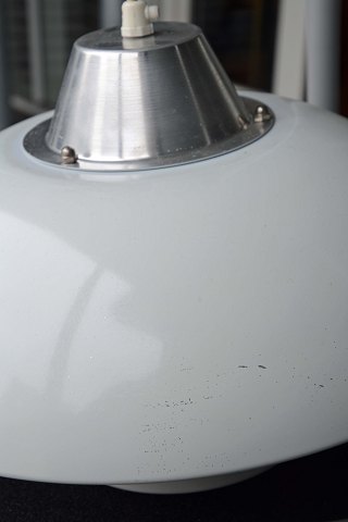Loftslampe pendel i hvidlakeret metal med rød inderside. Brugsspor på skærmens yderside.