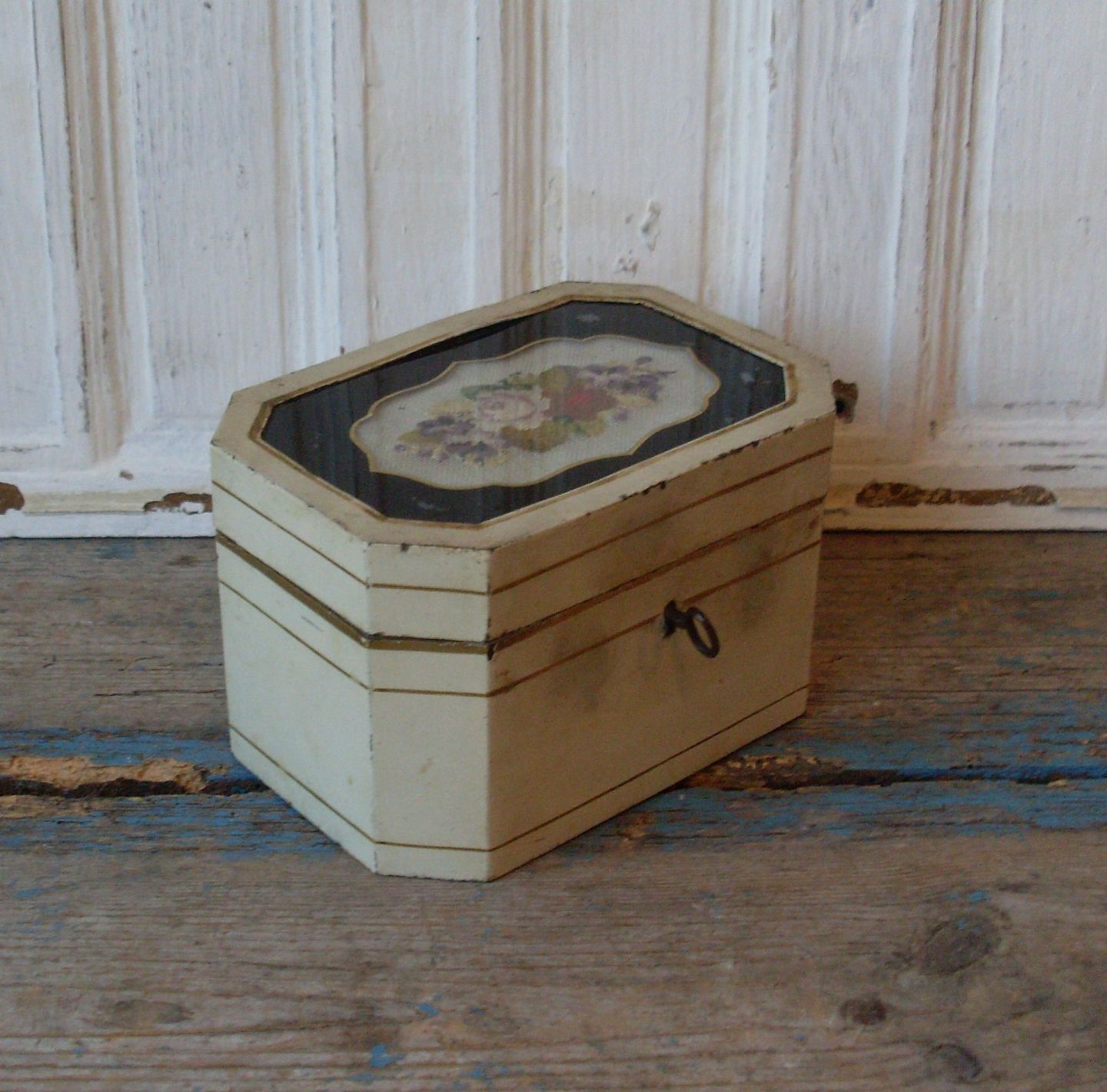 Skrinet er fremstillet i metal, låget er dekoreret med et fint lille "petit point" broderi bag glas, bemærk skrinet har nøgle.