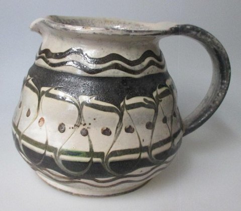 Herman A. Kähler mælke kande, 1920- 1930'erne, Næstved, Danmark. Over glasurer i creme-, sort og grønt. H.: 14,5 cm.  Signeret: HAK. Danmark.