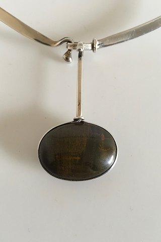 Georg Jensen Sterling Sølv Torun Halsring No 168 med Vedhæng No 129 af Jasper Sten. Designet af Vivianna Torun Bülow-Hübe. Halsringen er 16.5 x 13.5 cm i bredden. Vedhæng måler 3.1 x 2.5 cm. Samlet vægt er 29 g.