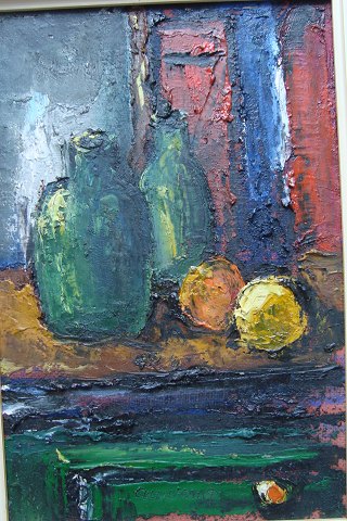 Maleri - Opstilling med flasker og frugt af Adelbert Winther Venø.