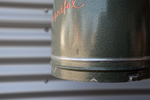 Loftslampe med skriften Magnifax er med skærm i grågrøn metal og porcelænsfatning. Loftslampen er fremstillet af et gammelt foto forstørrelsesapparat. Fremstår med brugsspor.