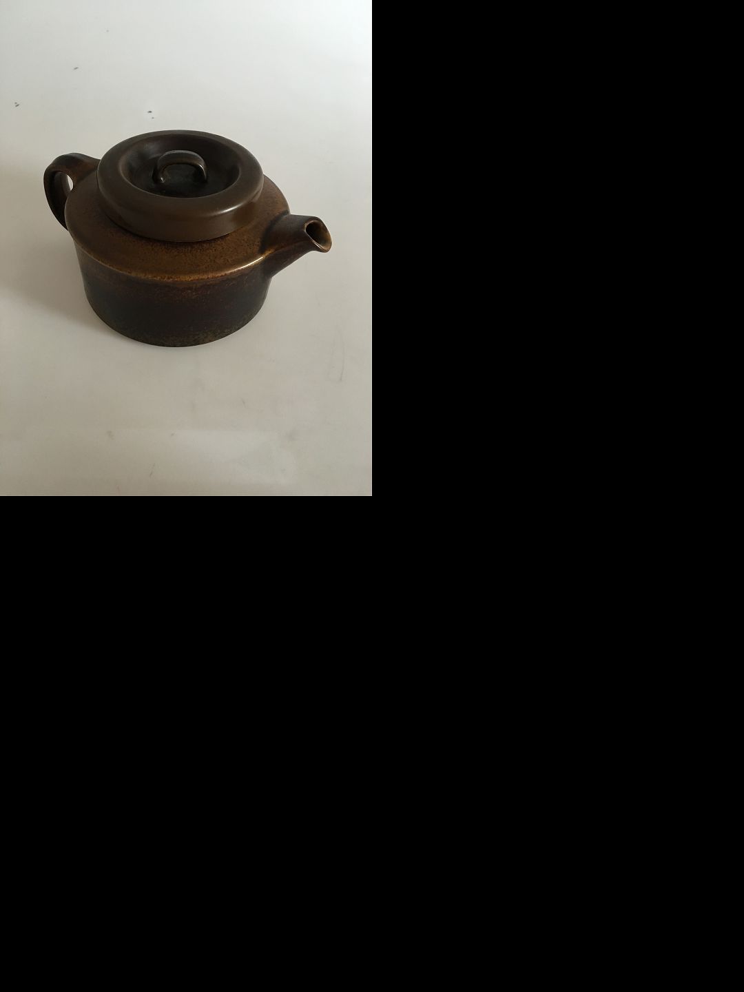Arabia Stoneware Ruska Teapot with strainer. Measures 8 cm x 16.5 cm (3 5/32 in. x 6 1/2 in.)