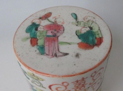 Four shared Chinese food container, Famille Rose, 19th century. Decorated with floral motifs and characters: double happiness. On the lid decoration with 5 people. Polychrome decoration. H .: 10.5 cm. Dia .: 9 cm.